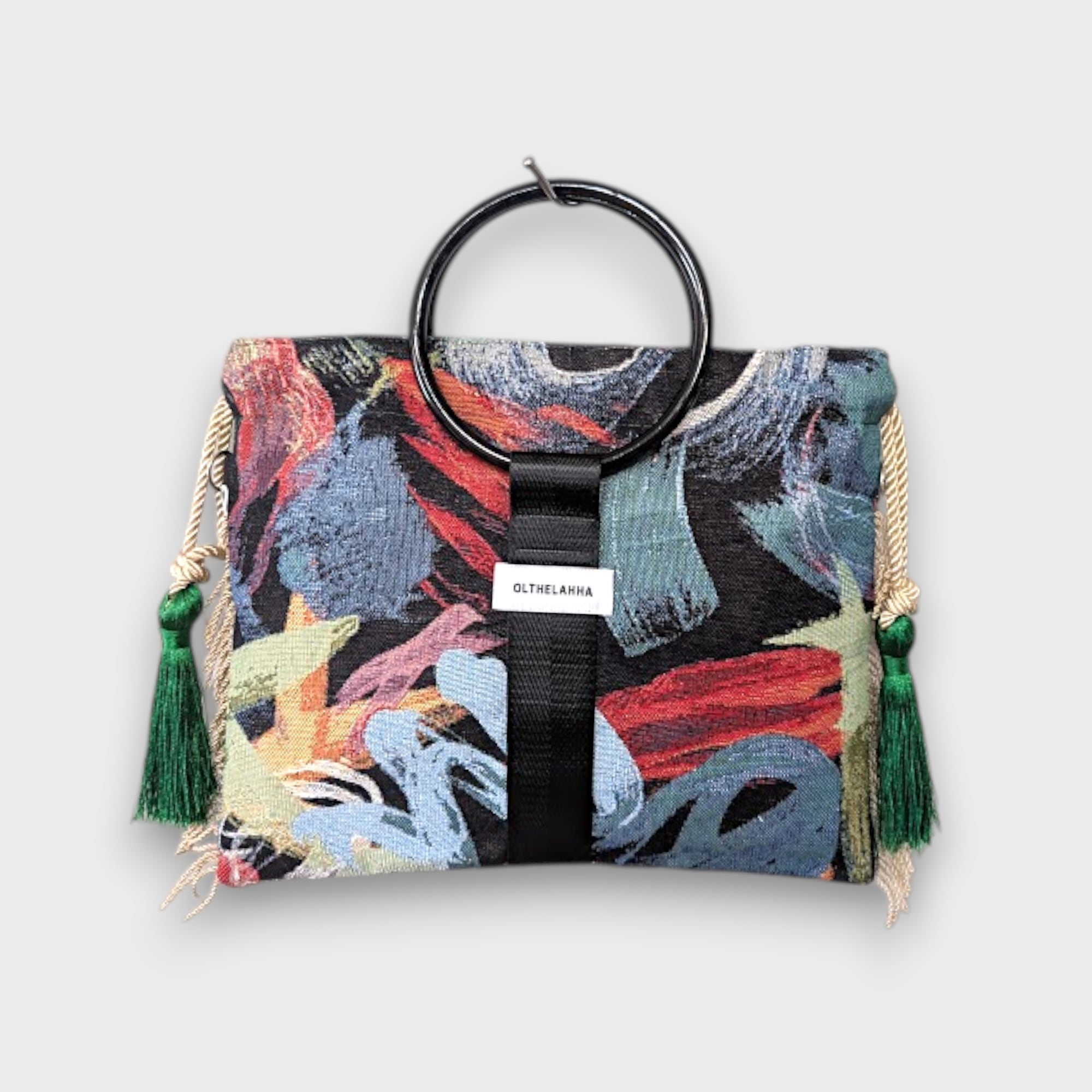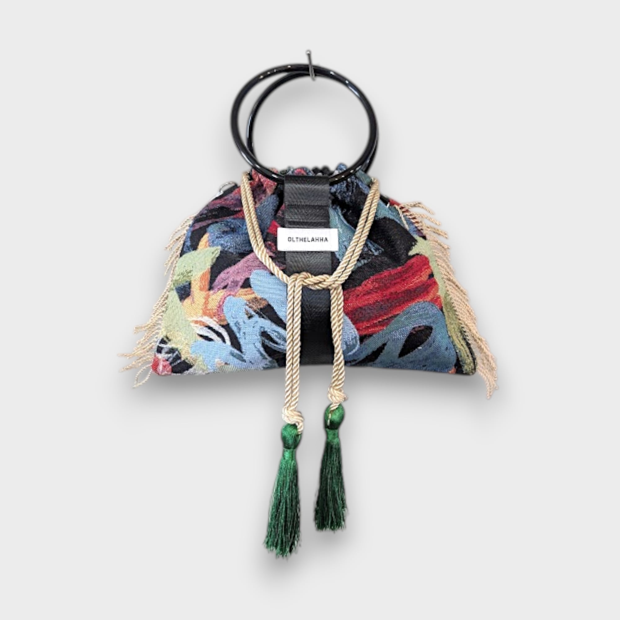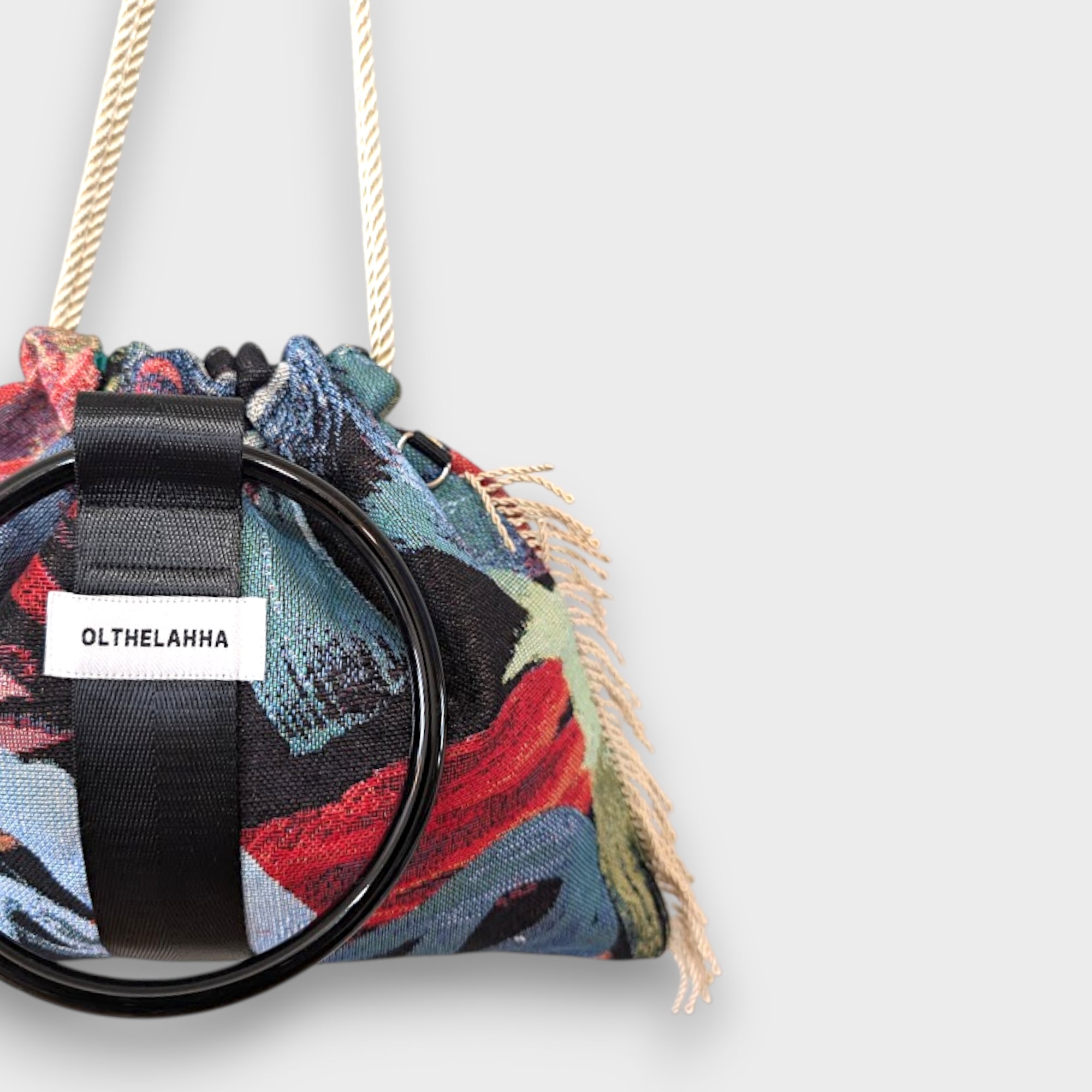 オランダのFABRICを使用したart漂うブラッシュアート模様が魅力的なリングタッセル巾着バッグになります。