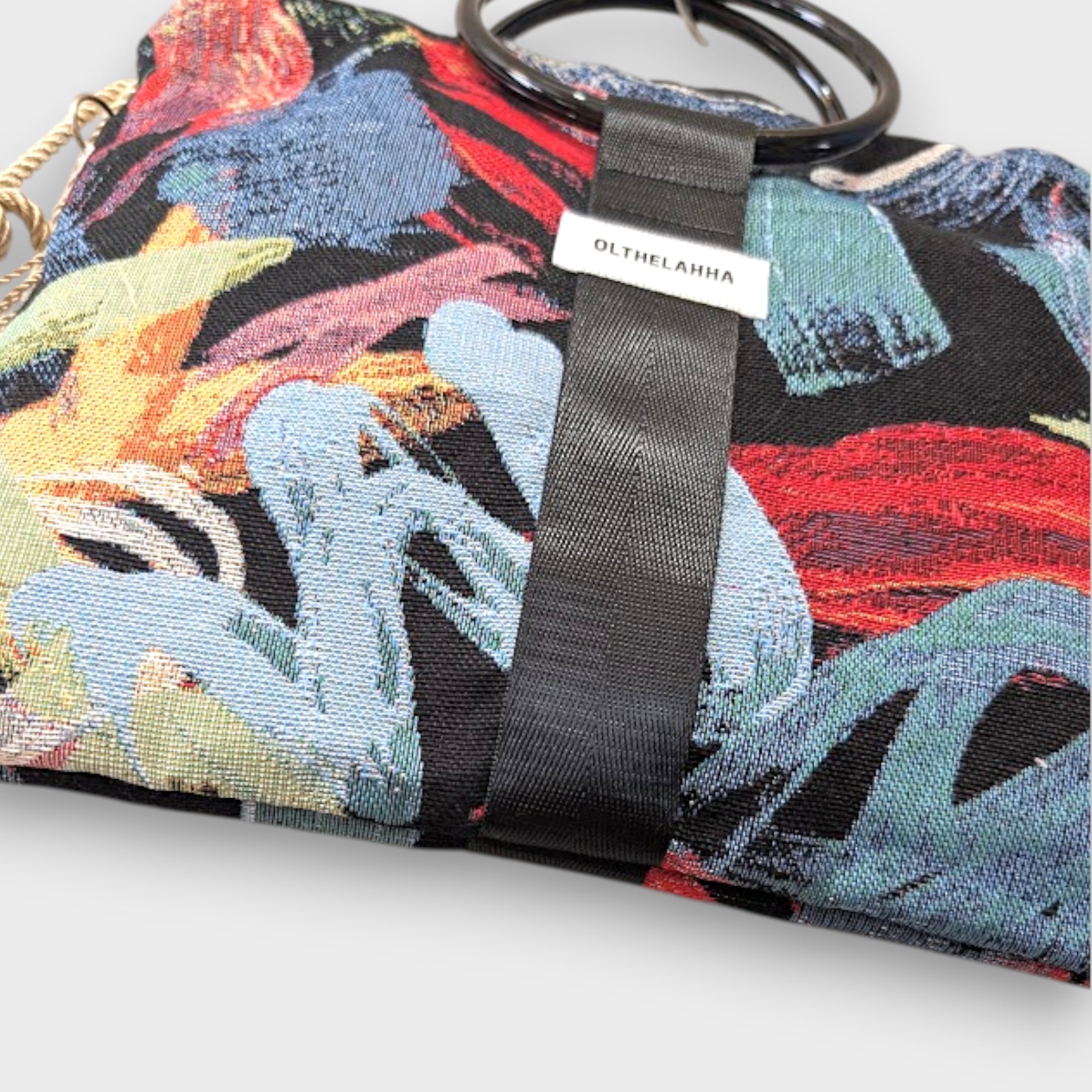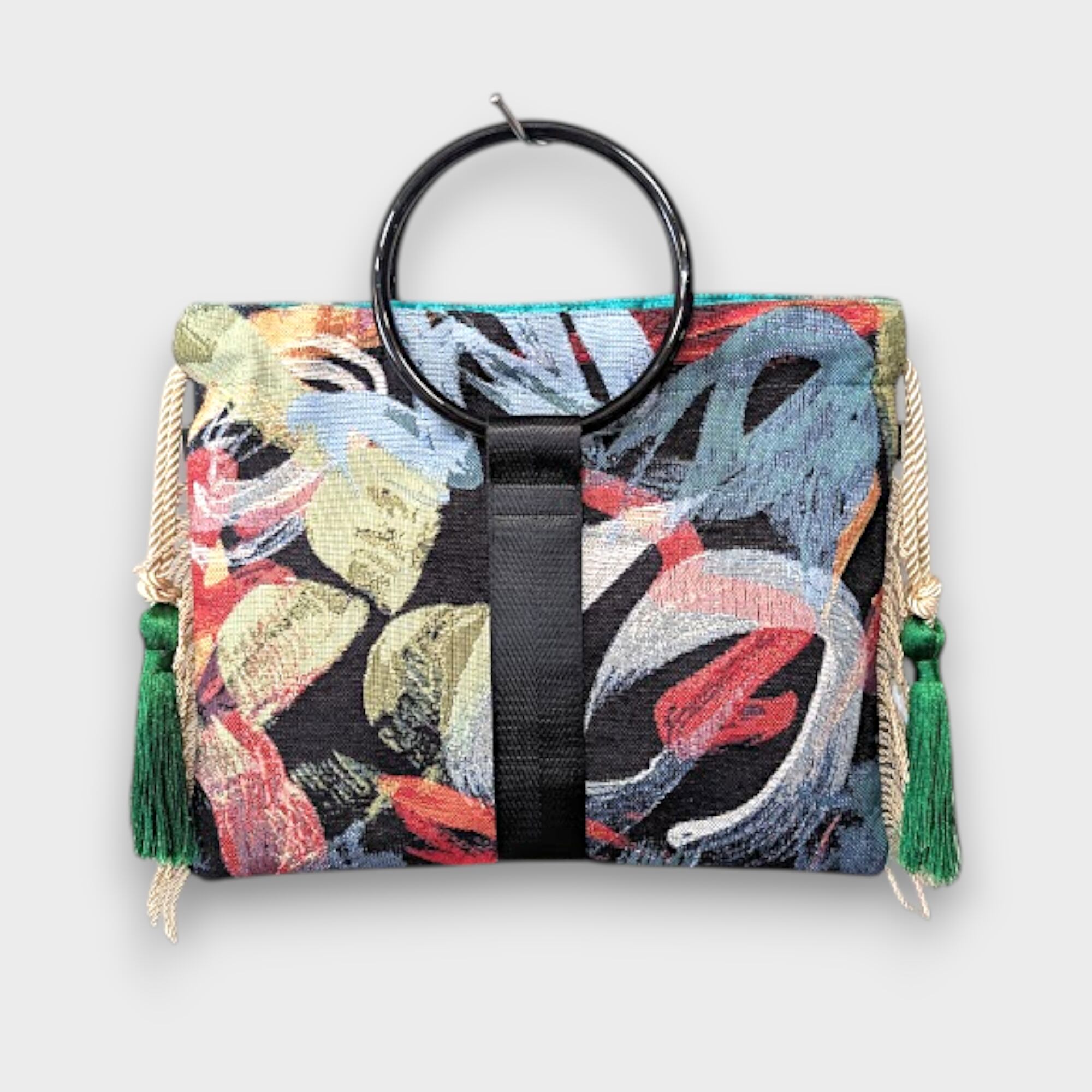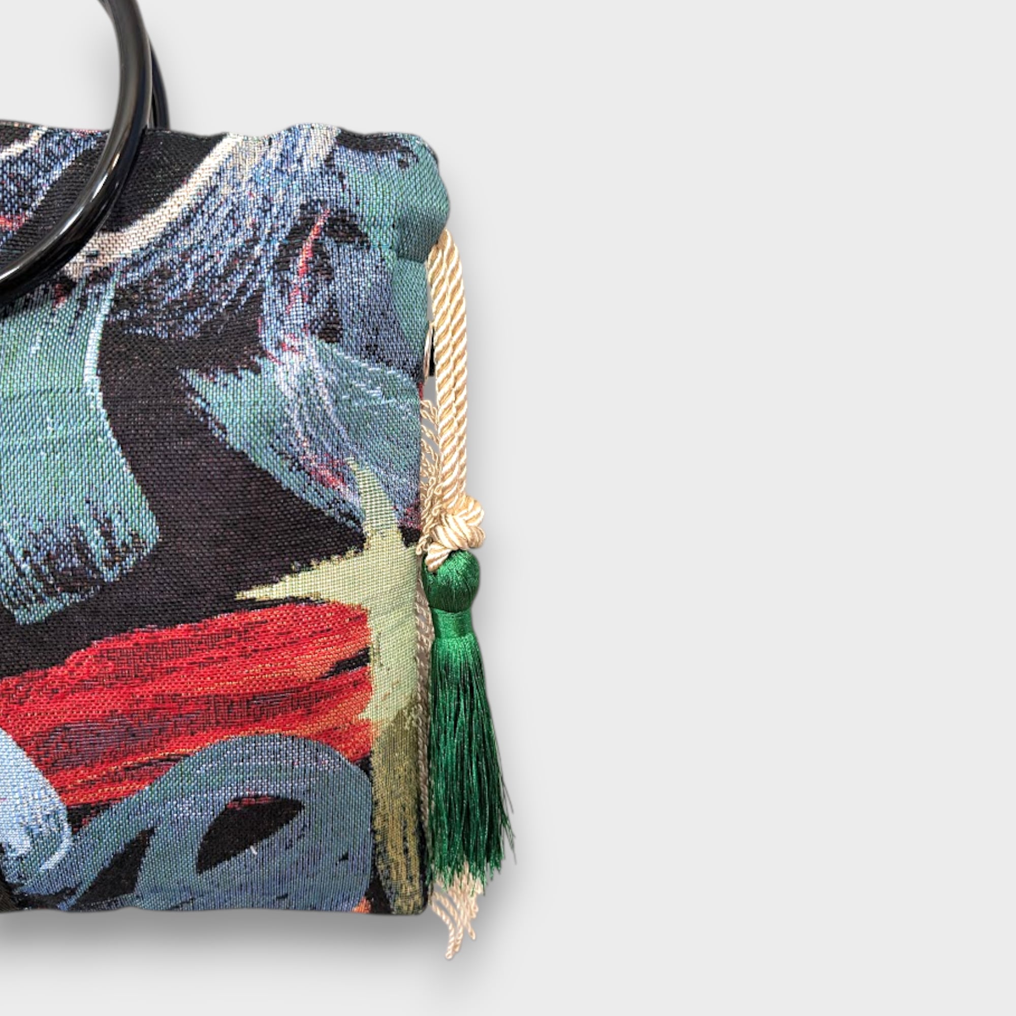 オランダのFABRICを使用したart漂うブラッシュアート模様が魅力的なリングタッセル巾着バッグになります。