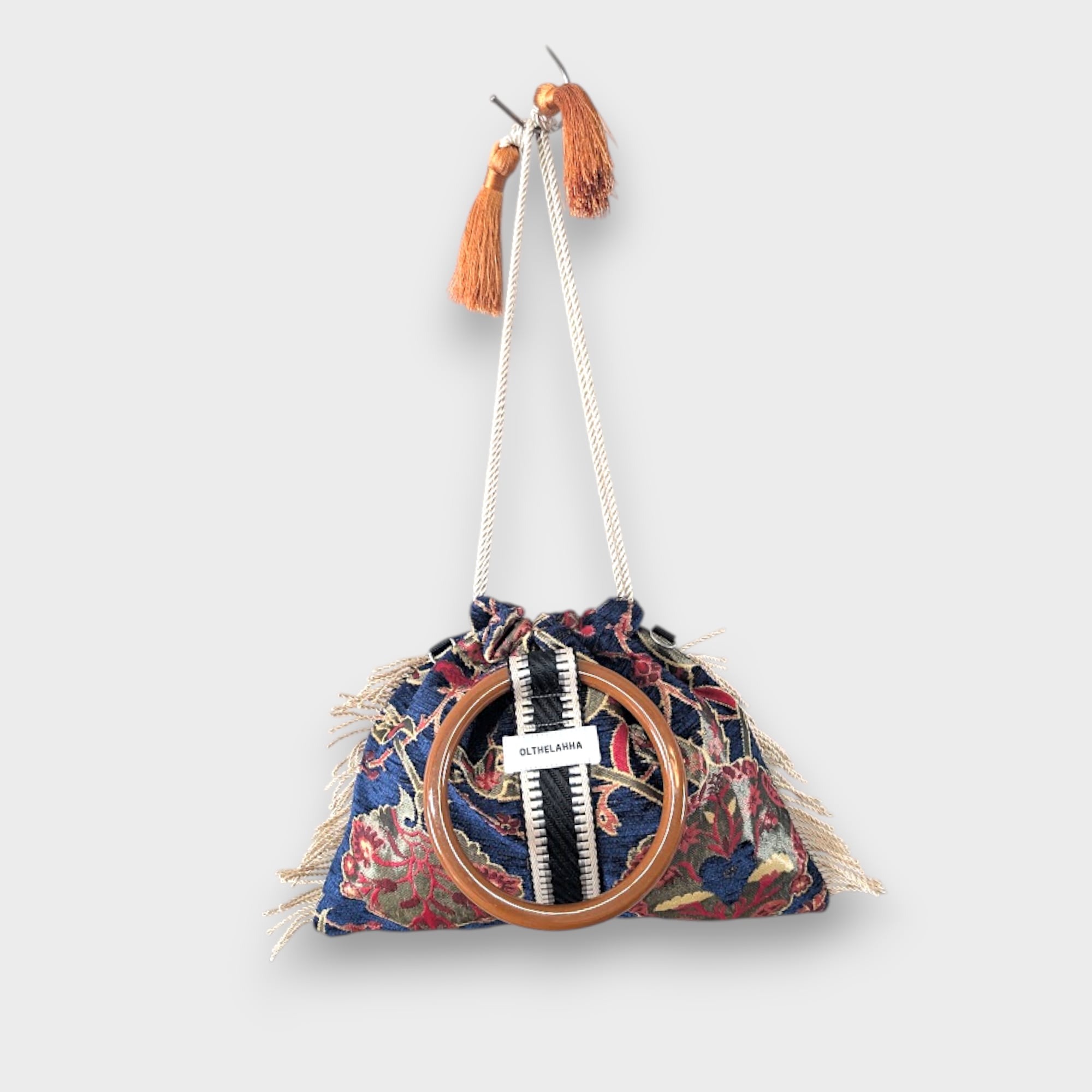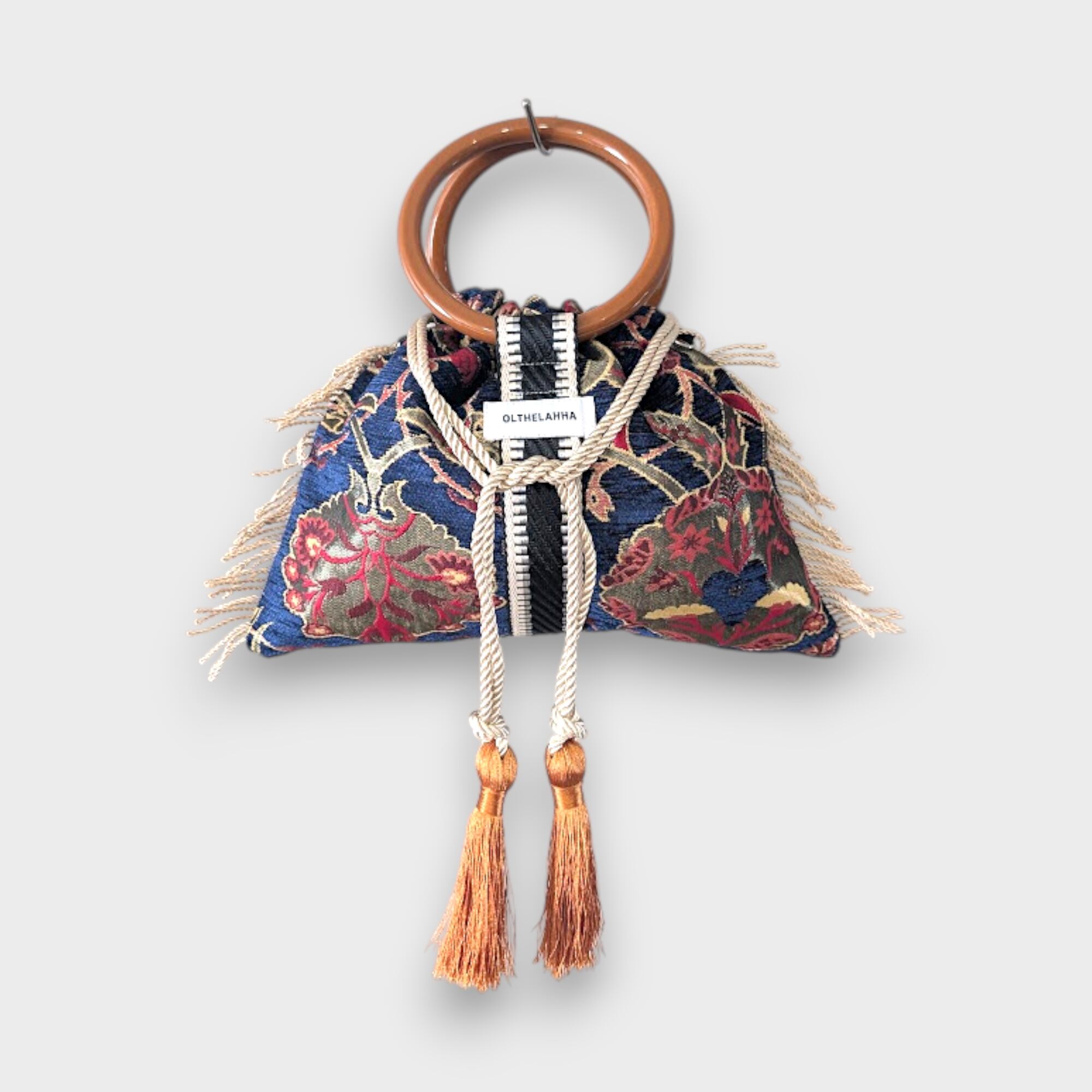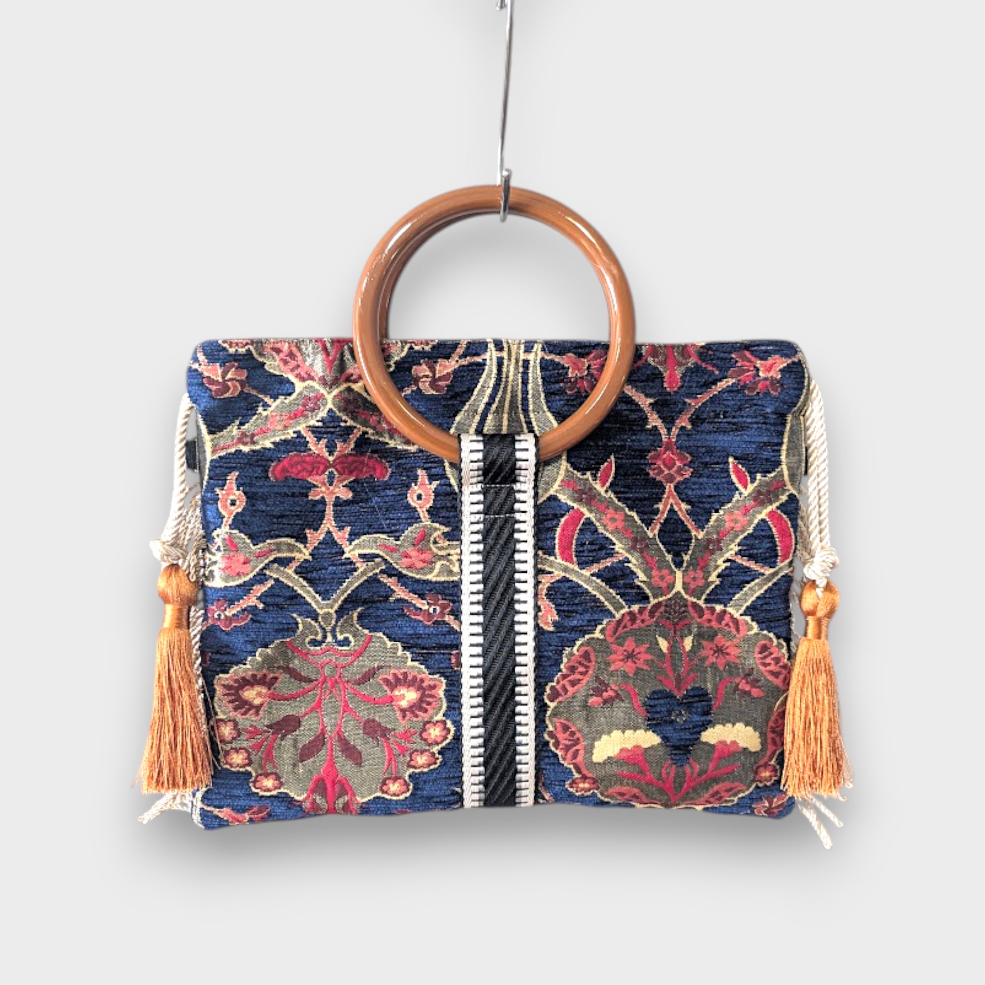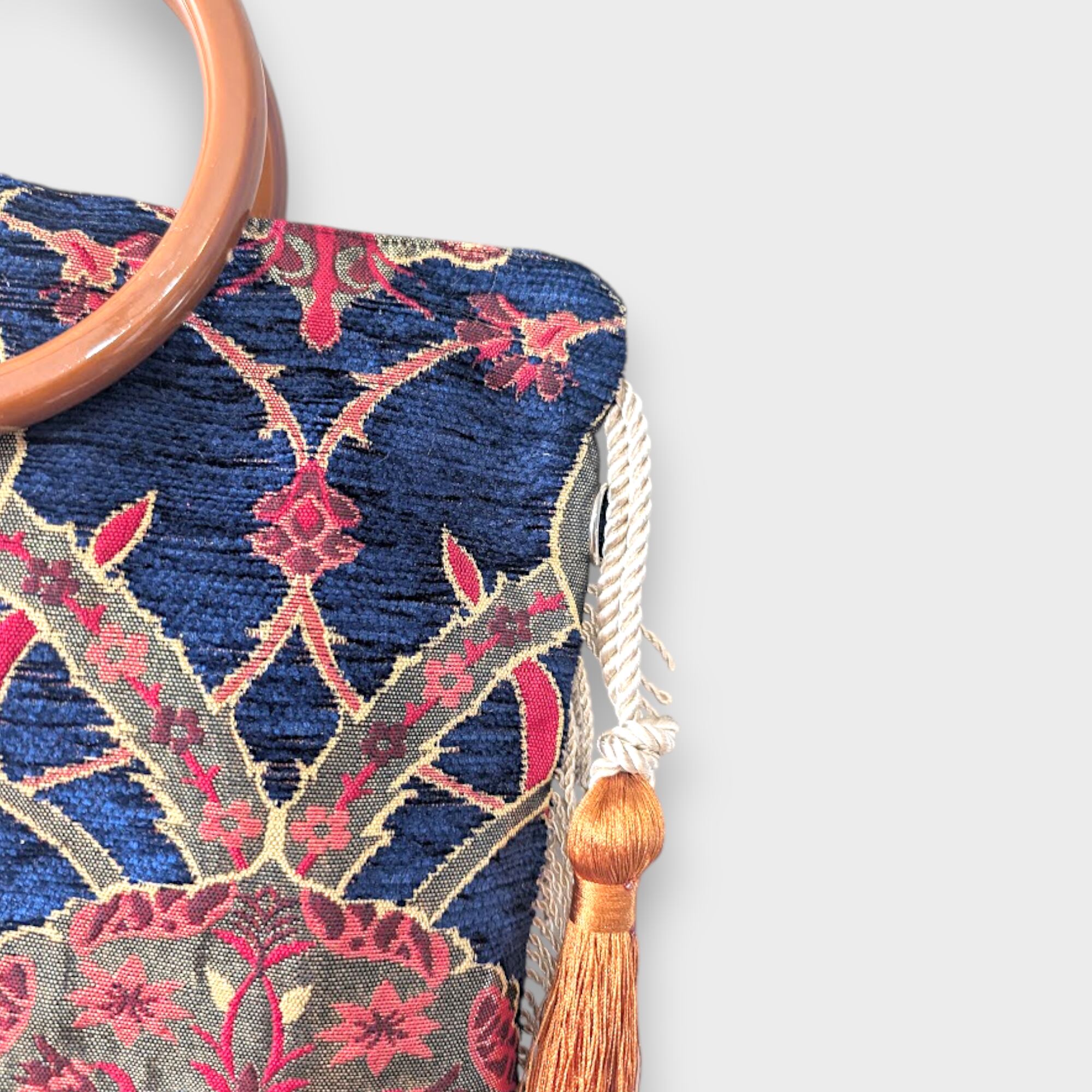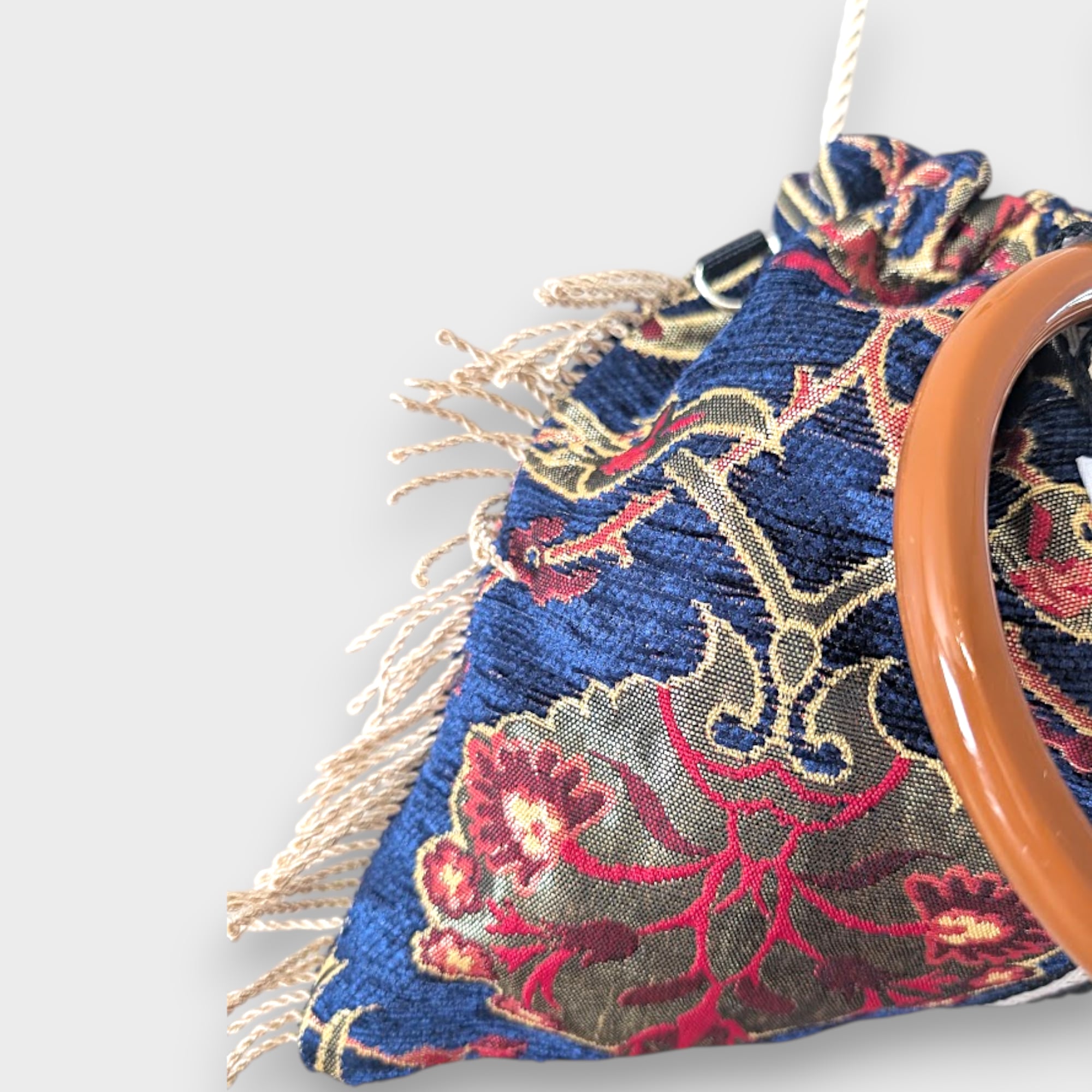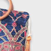 深いネイビー地に多色の糸で織り上げたジャカード生地は、