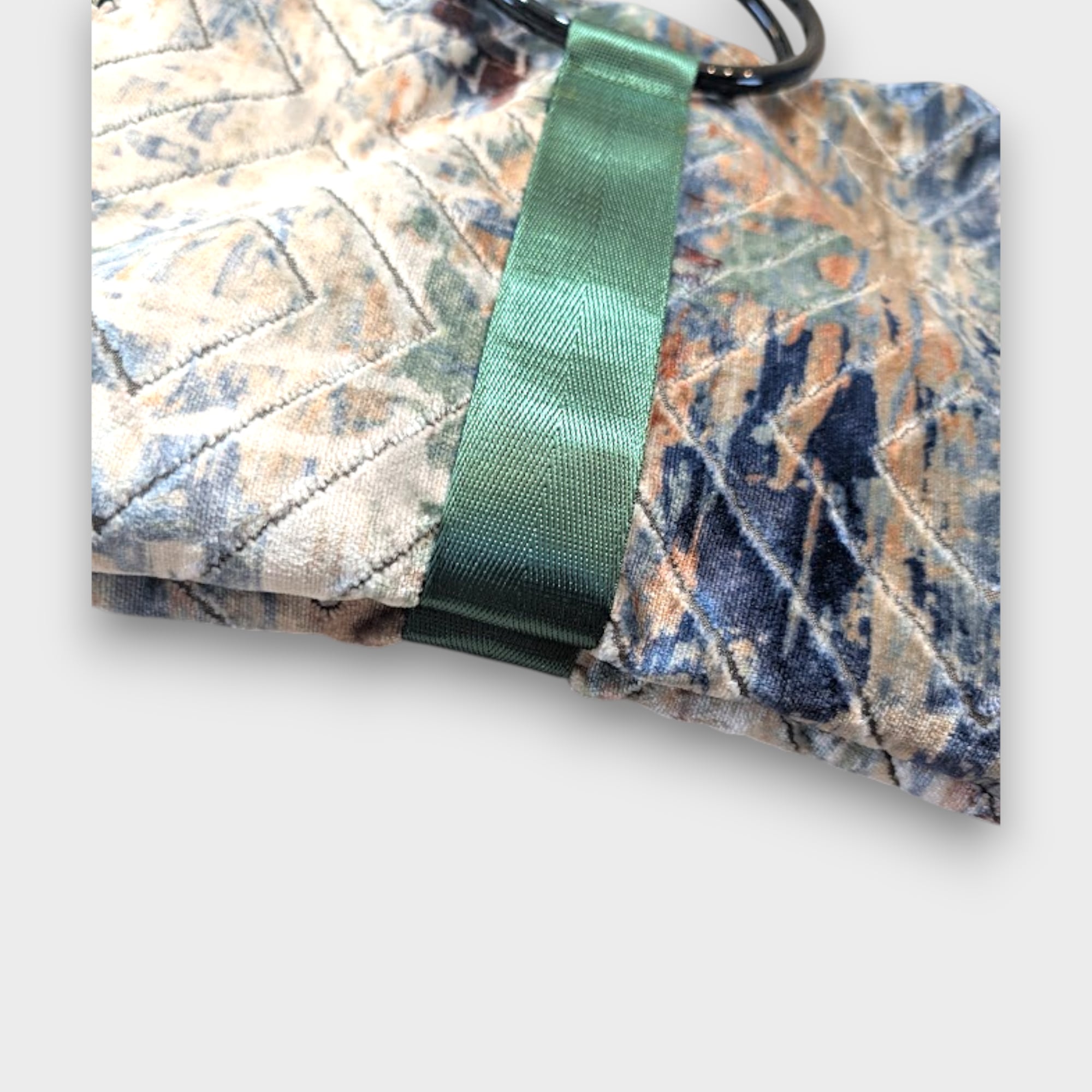 ブルーやベージュが溶け合うように重なったベロア生地は、