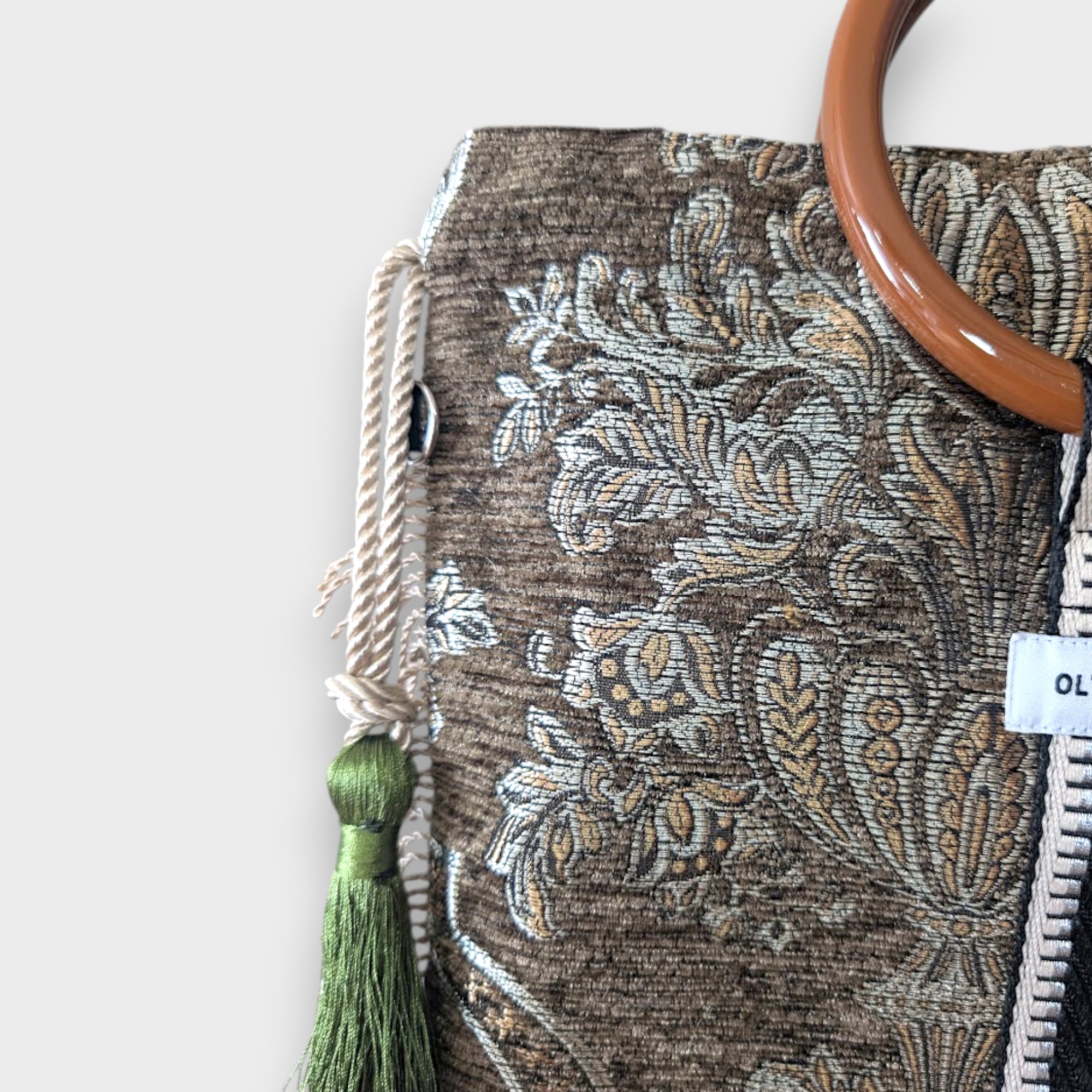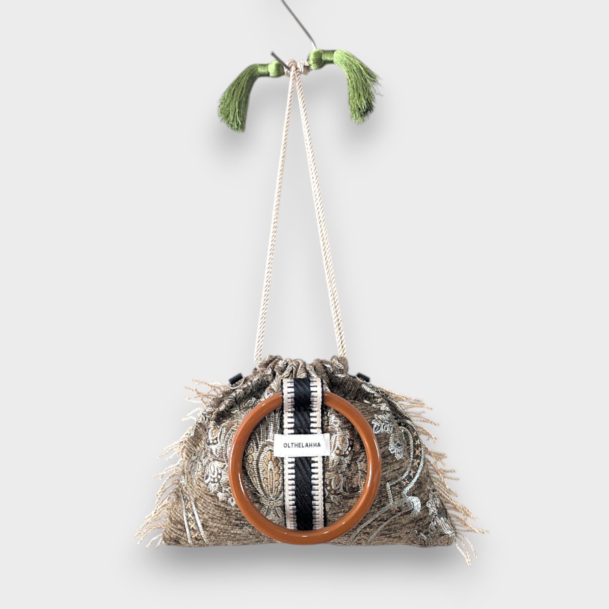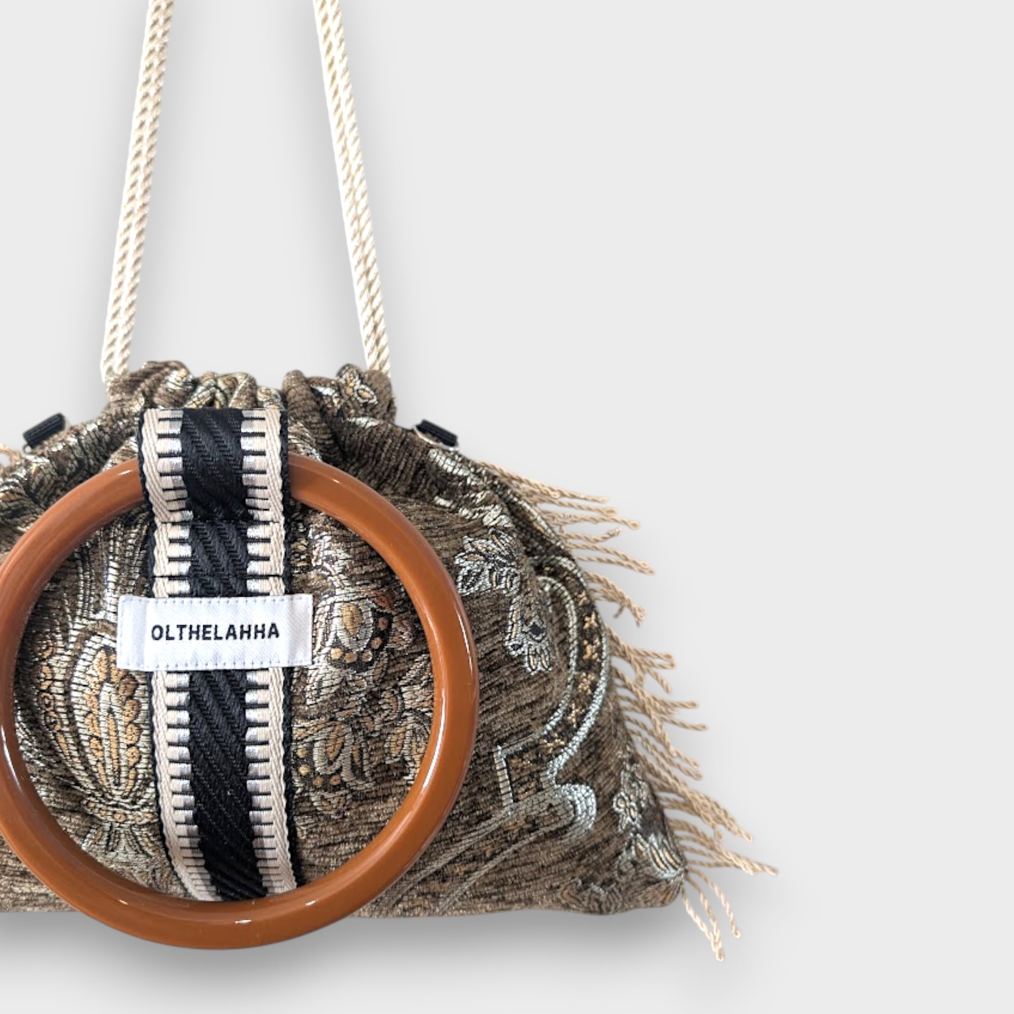 ヴィンテージライクなボタニカルモチーフが印象的な、アートピースのようなリングタッセルバッグ。