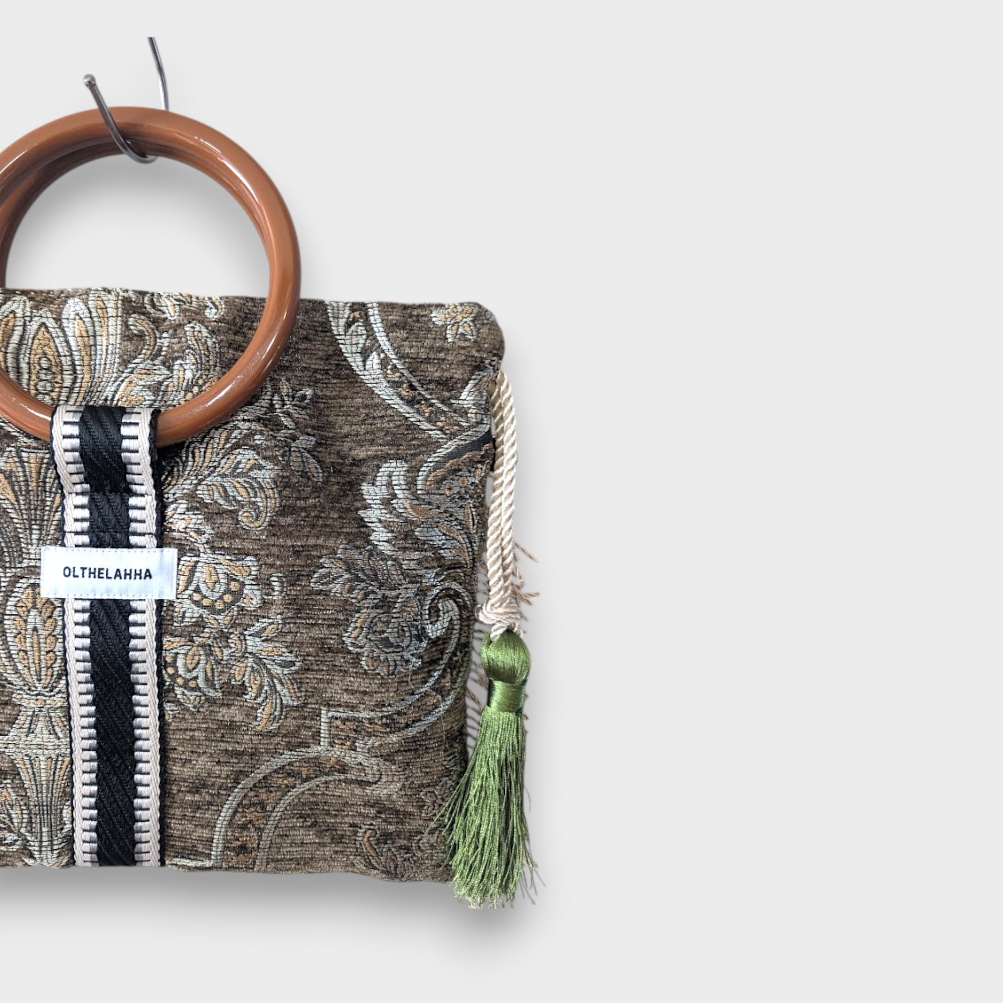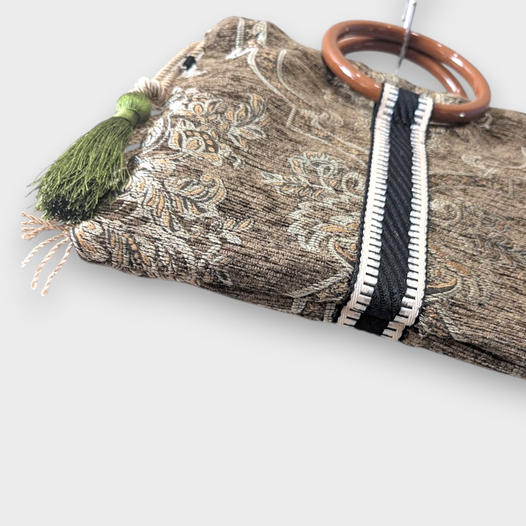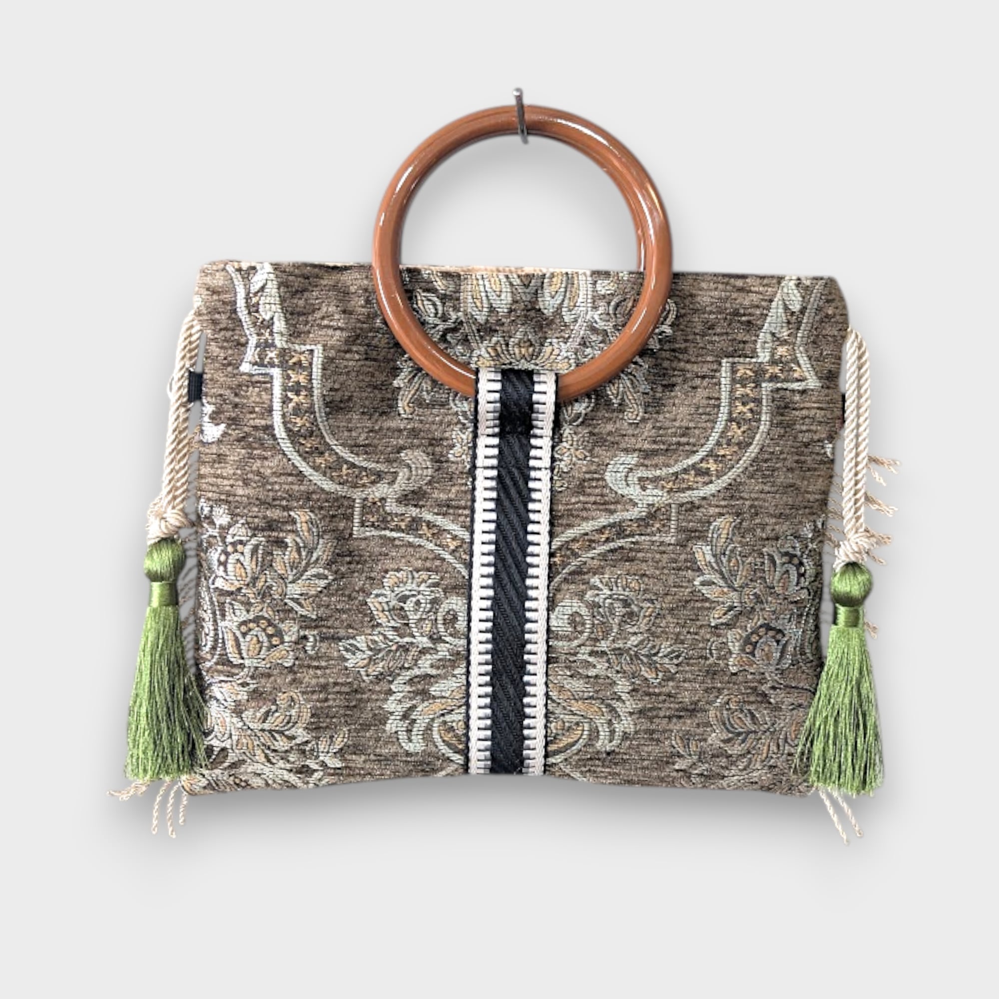 ヴィンテージライクなボタニカルモチーフが印象的な、アートピースのようなリングタッセルバッグ。
