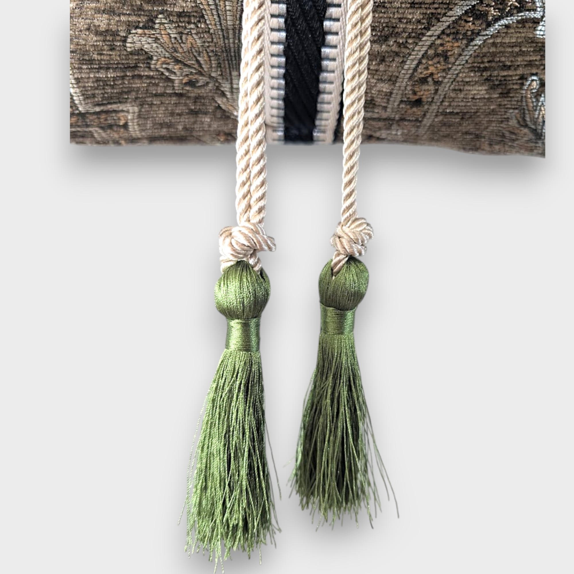 オリーブカラーのタッセルが、装いに静かなアクセントと、大人の遊び心を添えます。