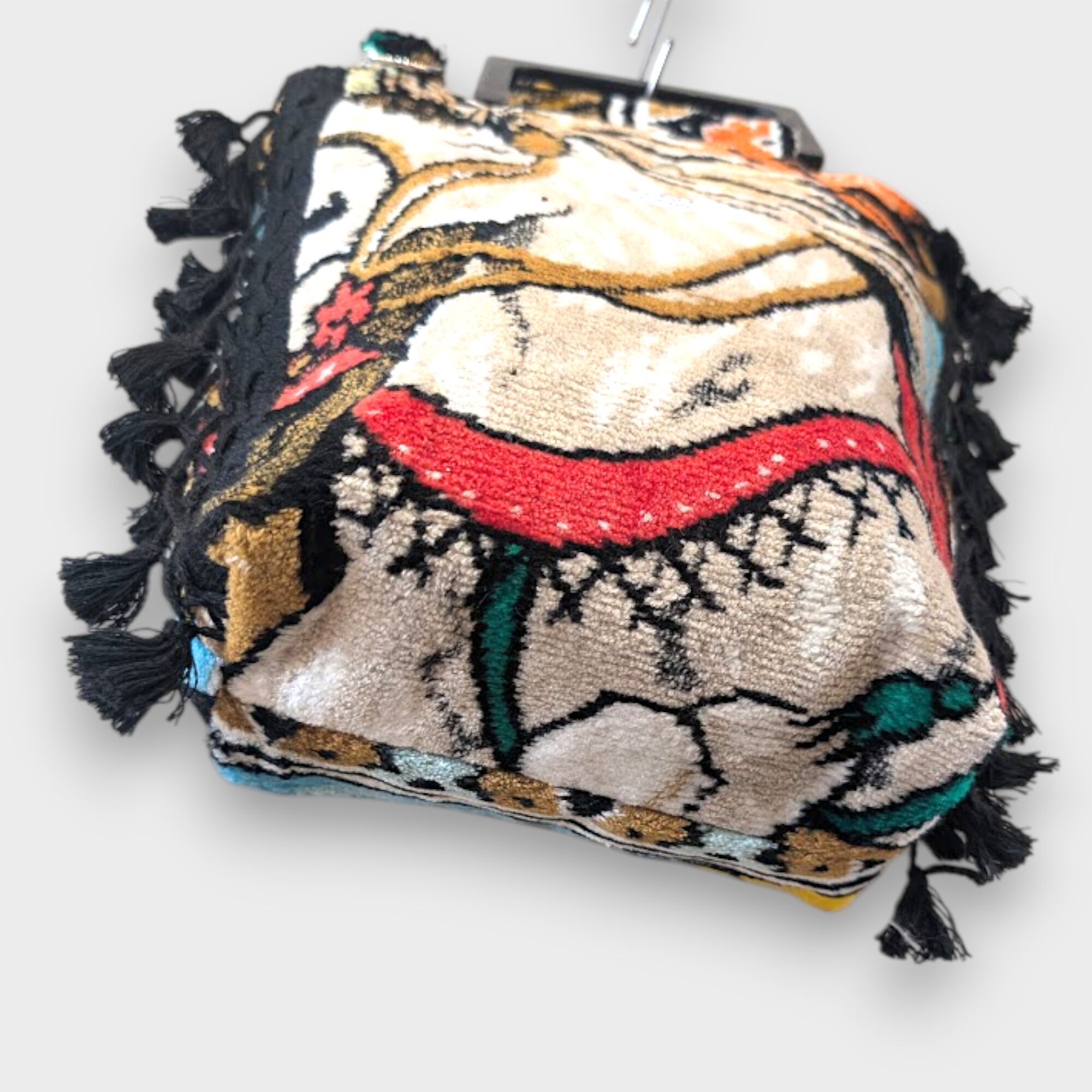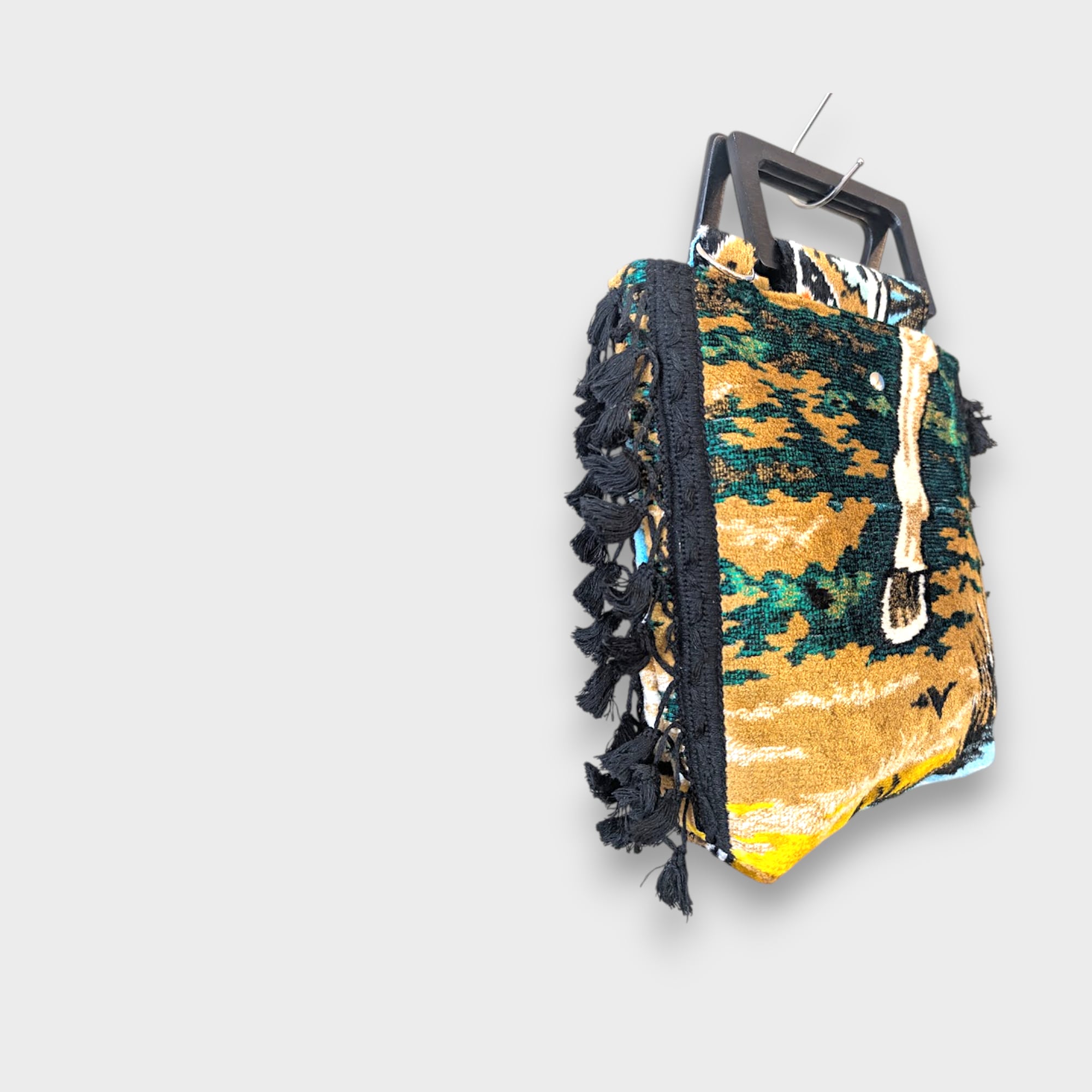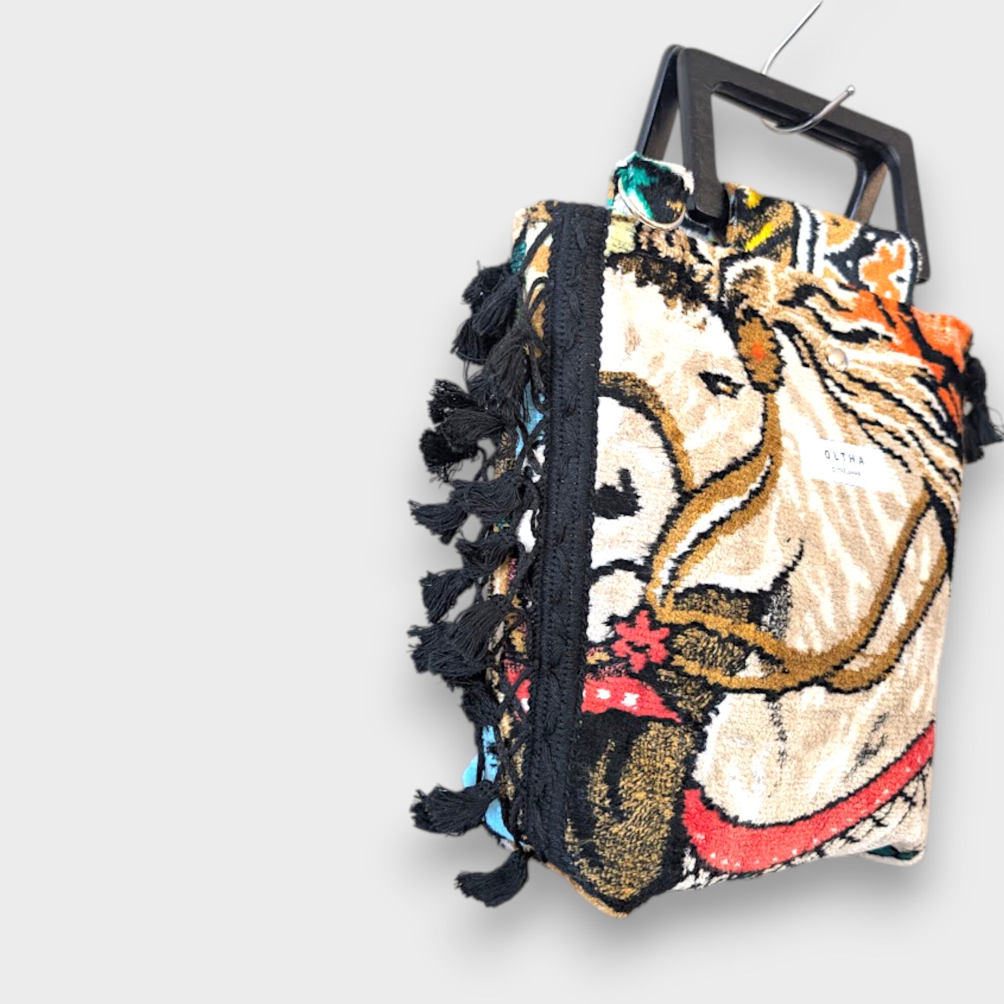 力強くも静かな佇まいの馬をモチーフにした、ヴィンテージタペストリー生地のサイドタッセルバッグ。