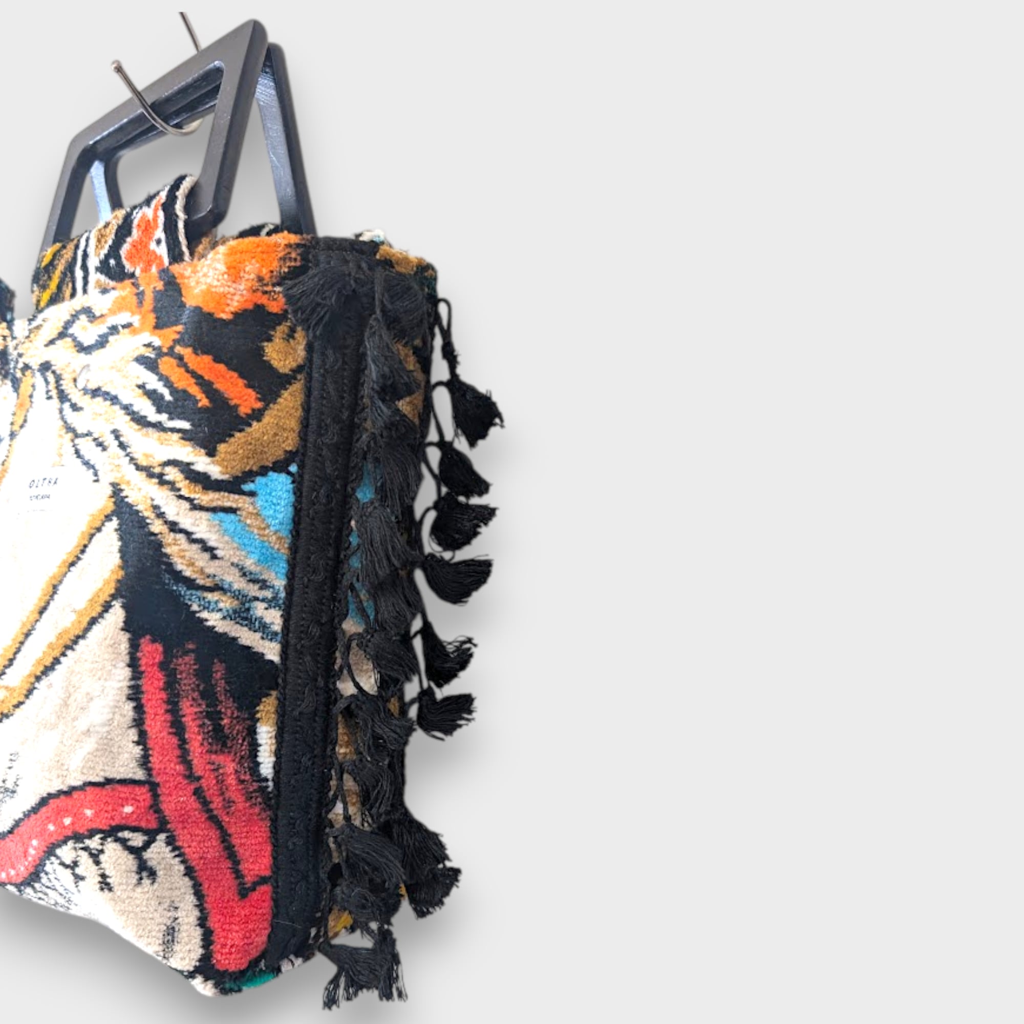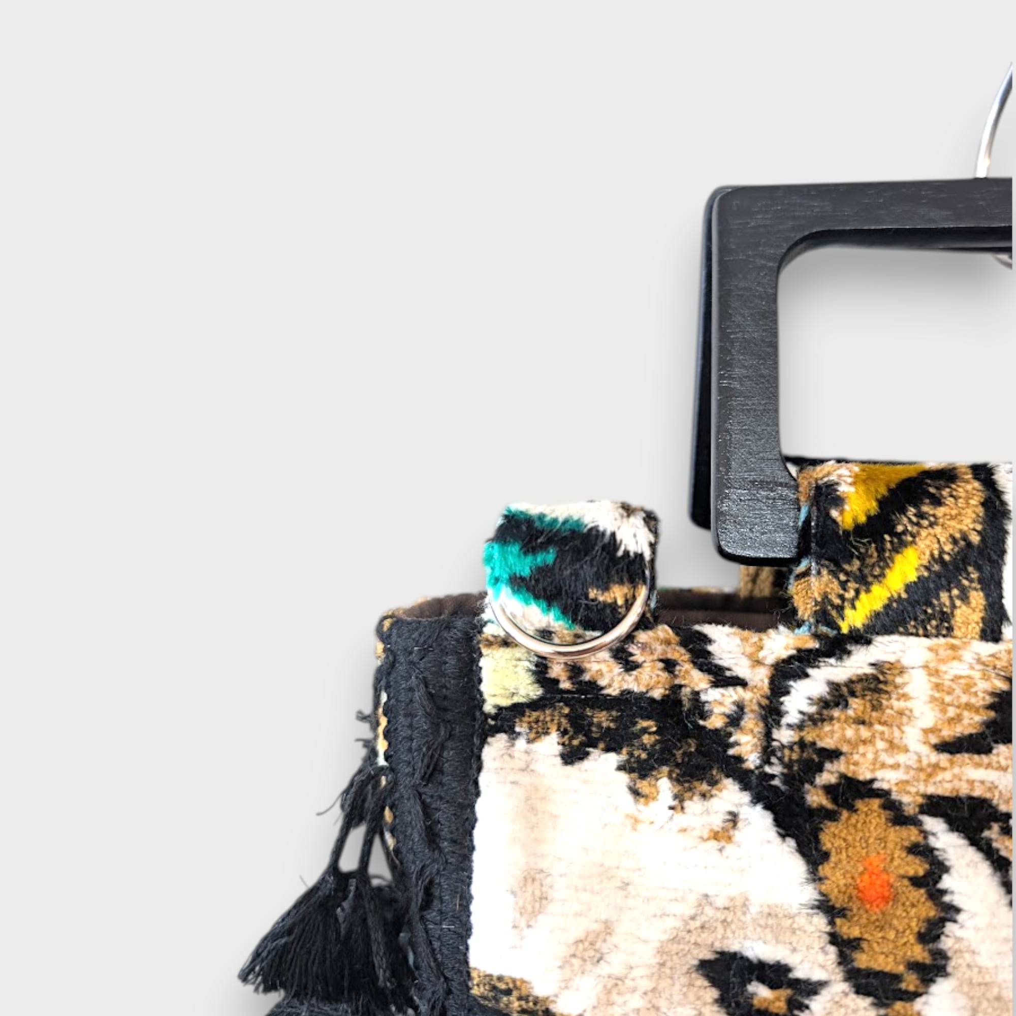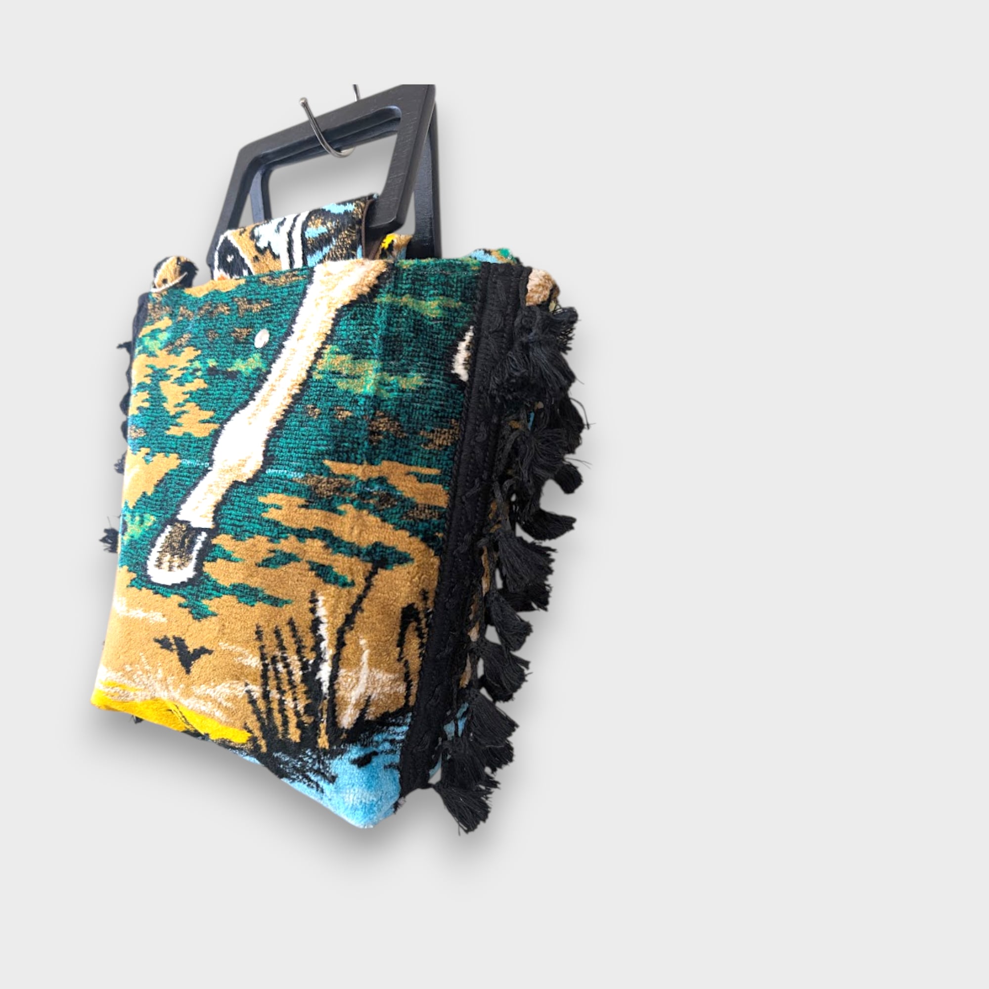 力強くも静かな佇まいの馬をモチーフにした、ヴィンテージタペストリー生地のサイドタッセルバッグ。