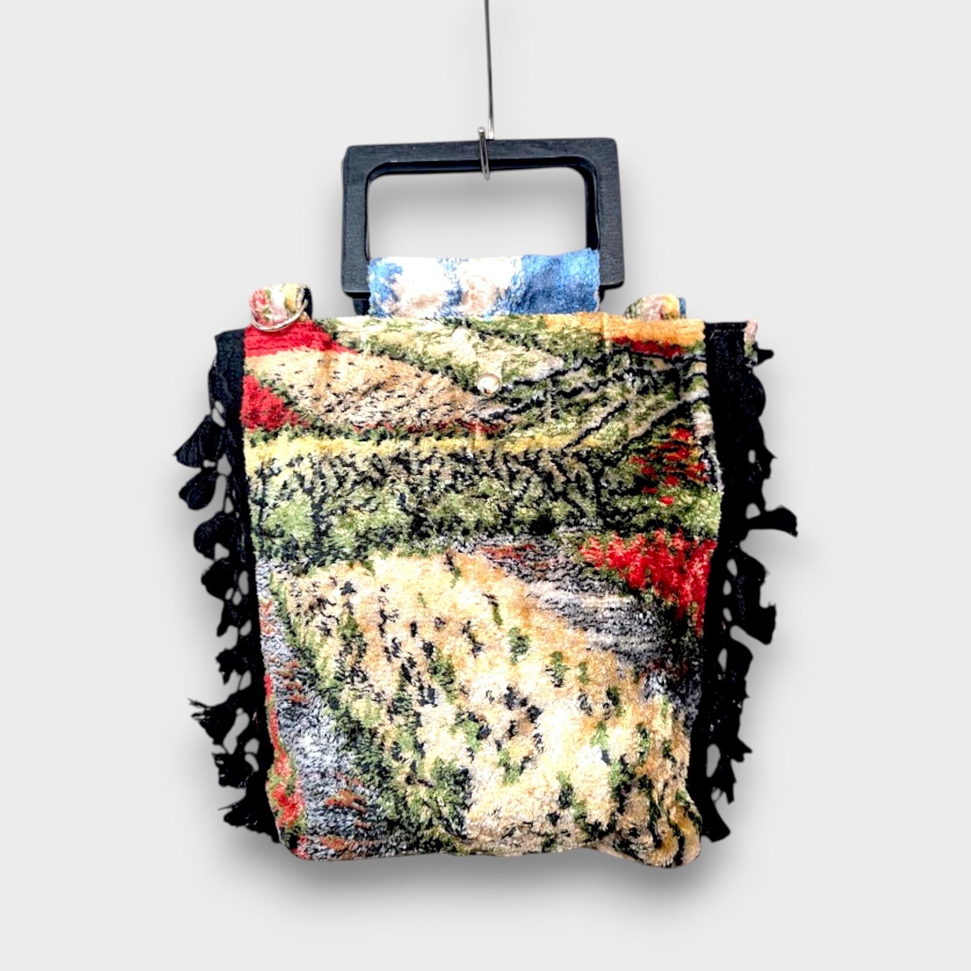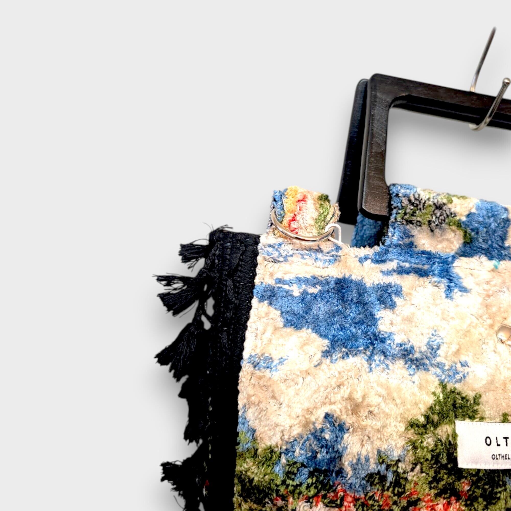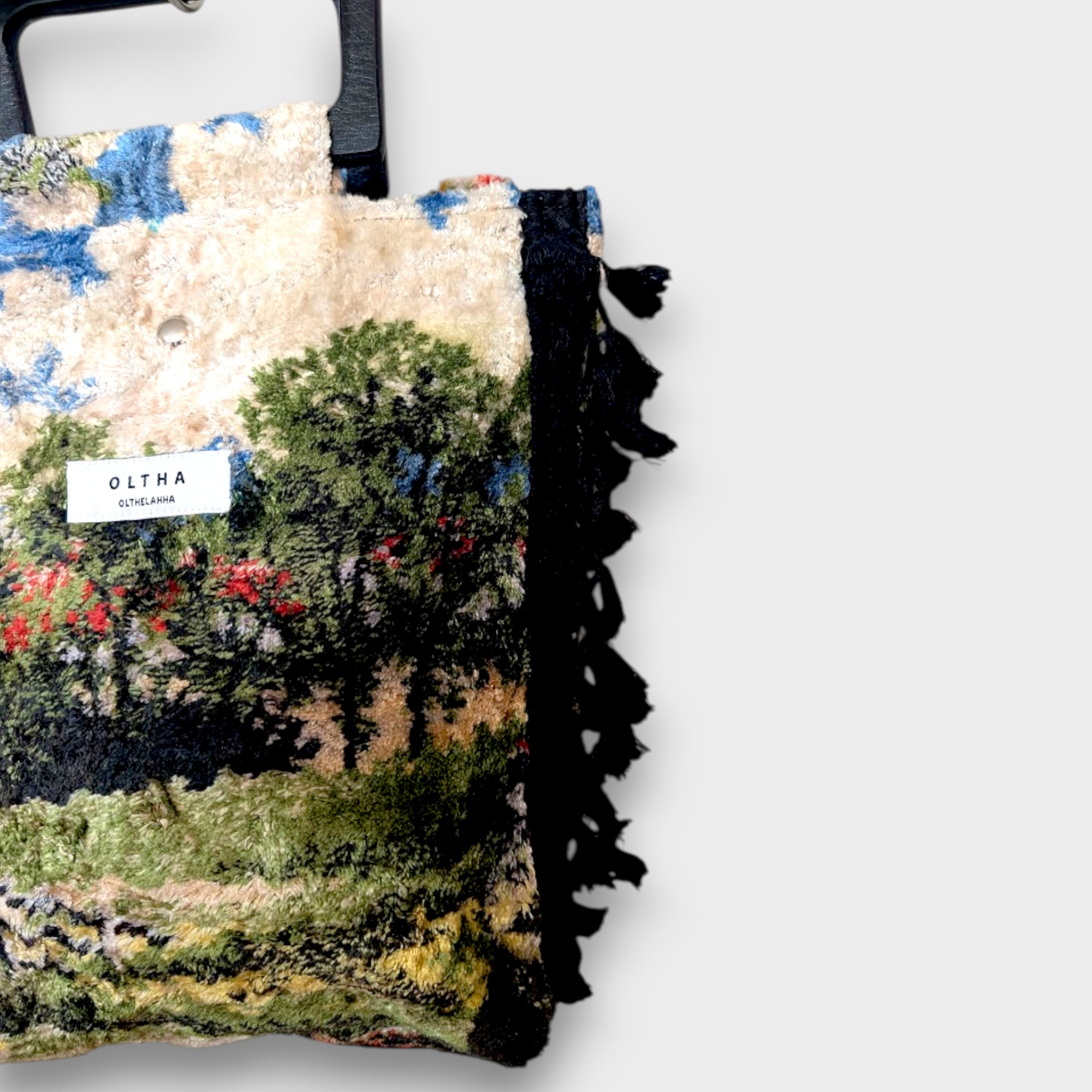 自然の風景を思わせるタペストリー生地を使用した、存在感のあるバッグ。