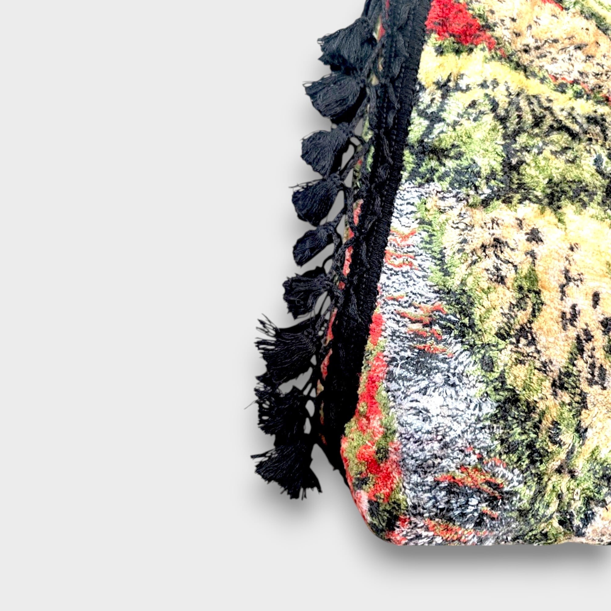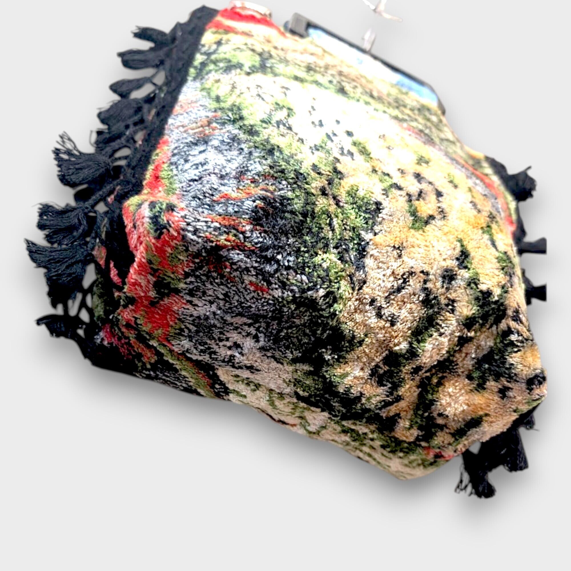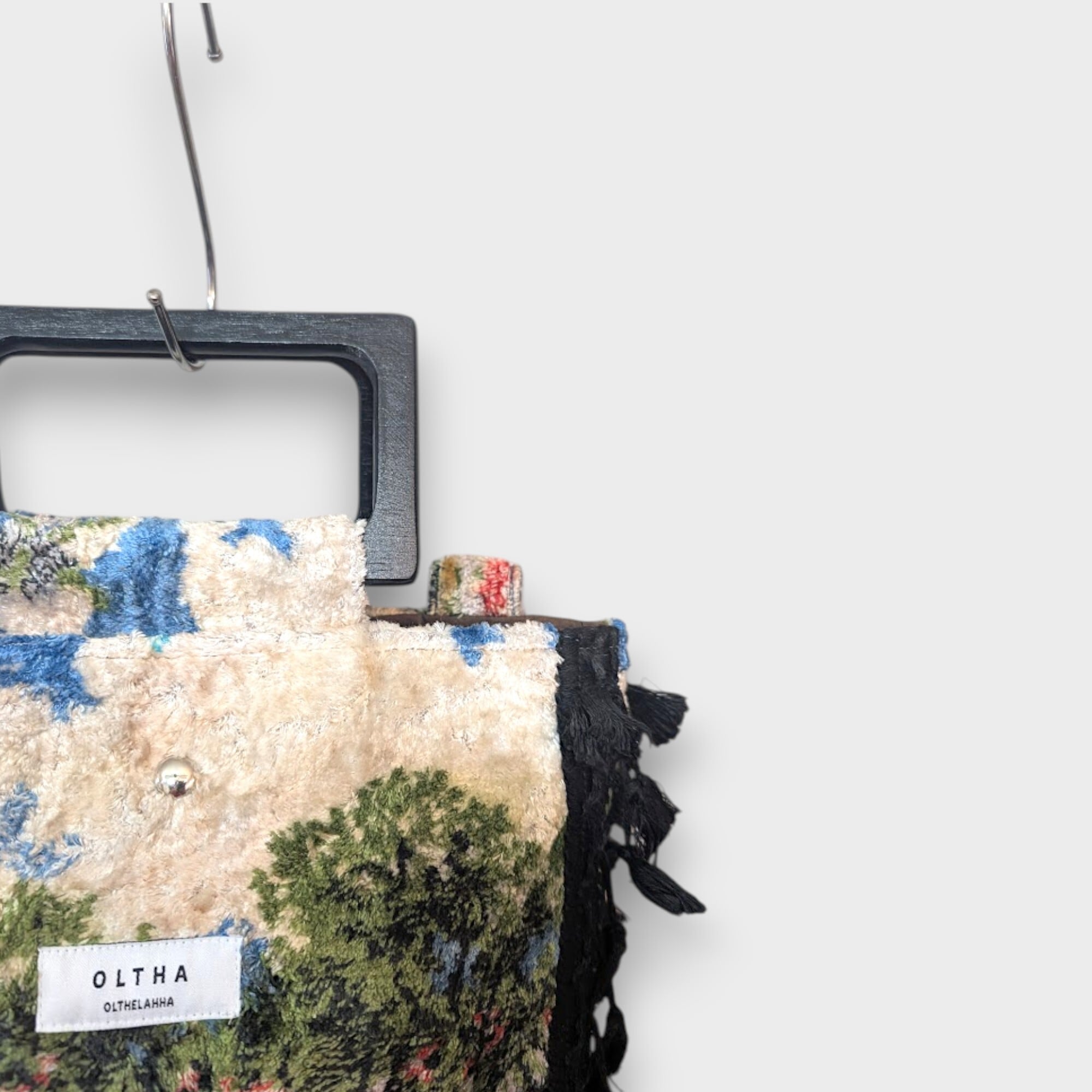 自然の風景を思わせるタペストリー生地を使用した、存在感のあるバッグ。