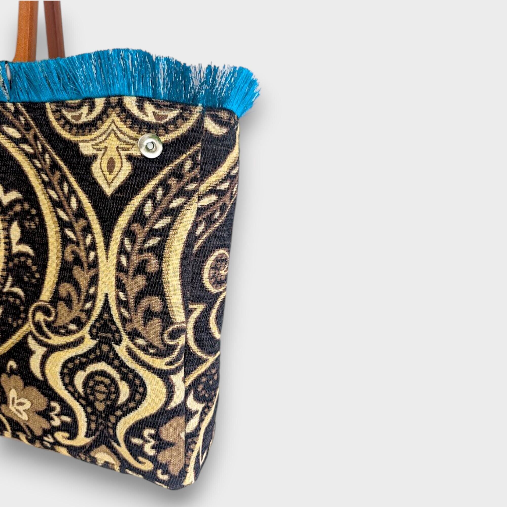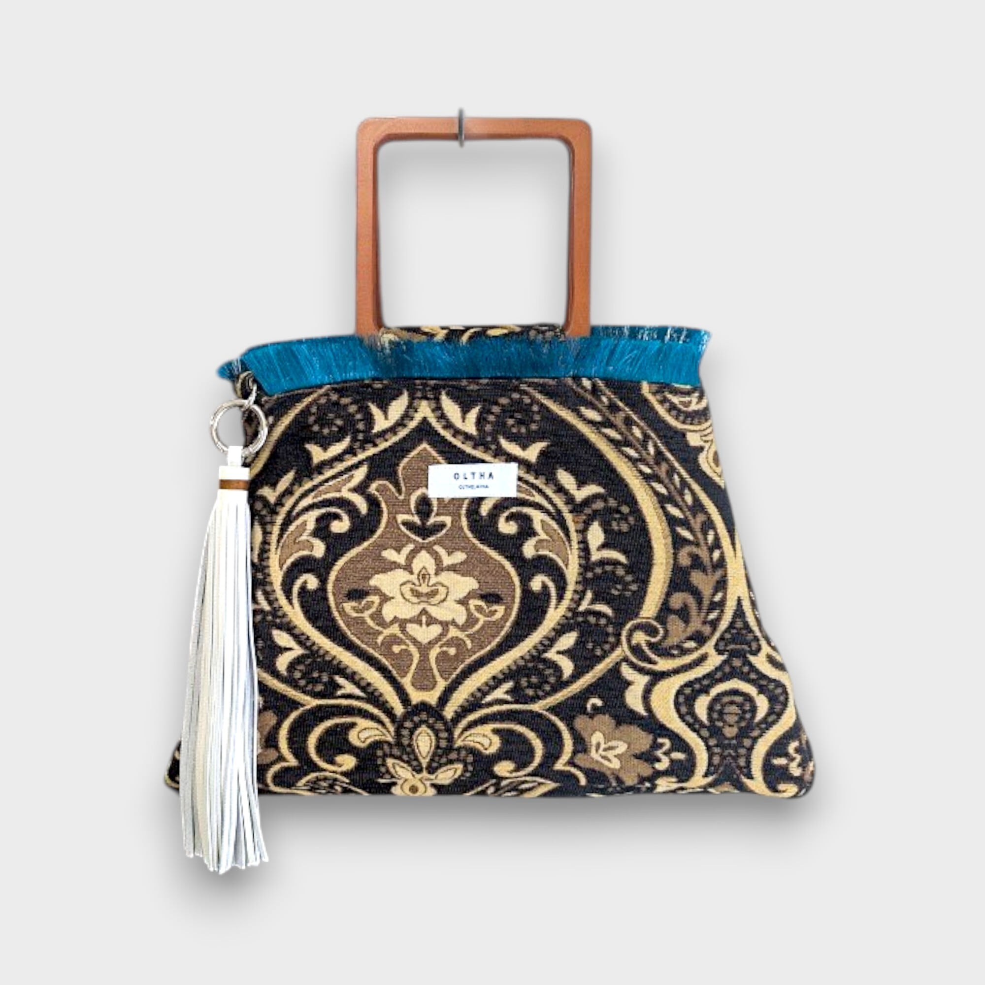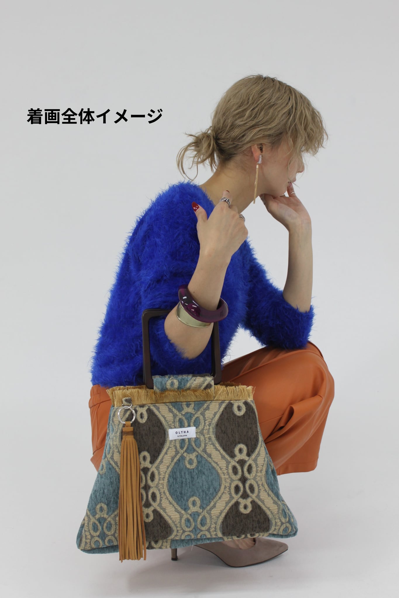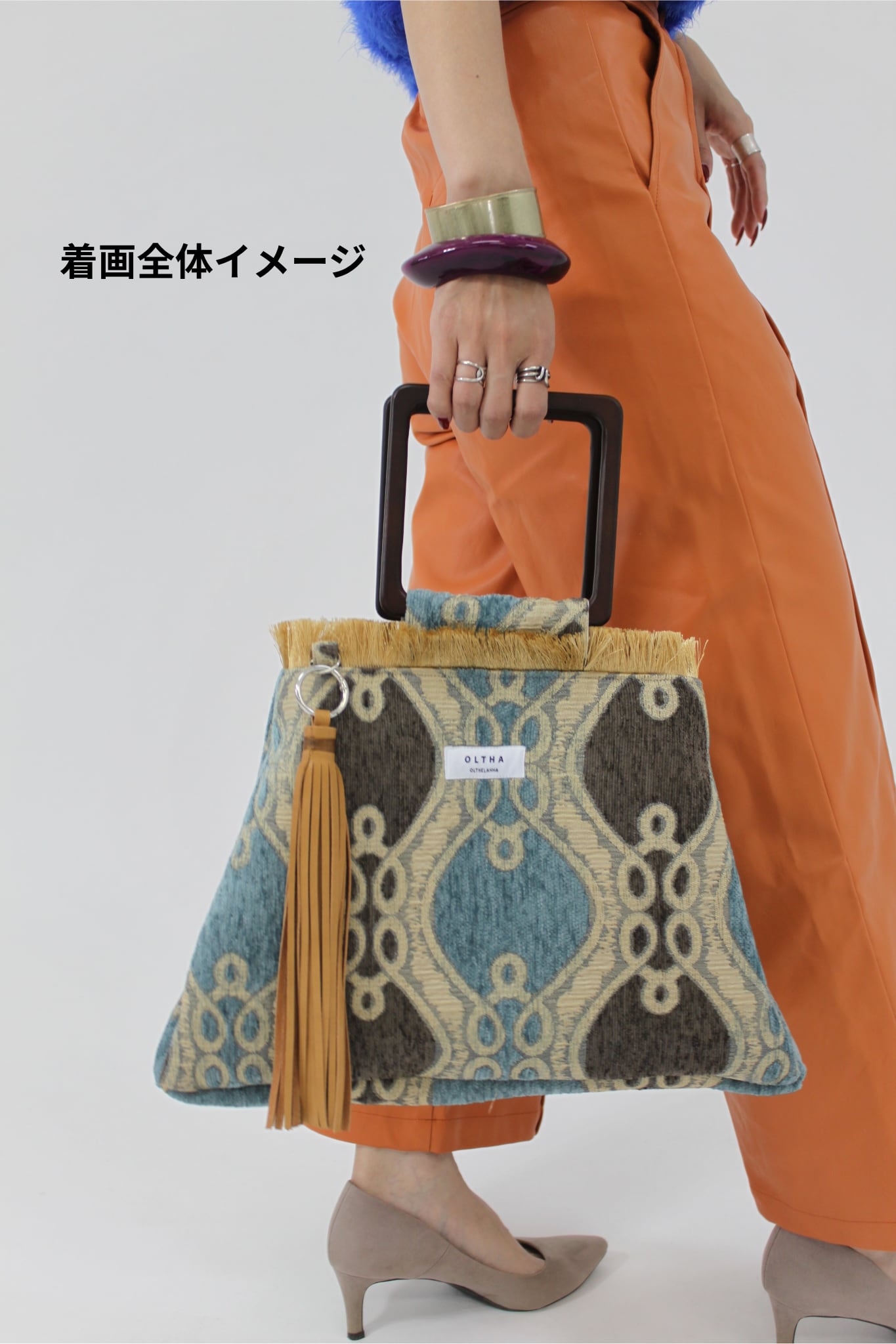 タッセルの揺れが動きにリズムを与え、シンプルなコーディネートに華やかさを加えてくれるアイテムです。また、持ち手のウッド素材が自然な温もりを演出、どんなスタイルにも合う万能なバッグとして重宝することでしょう。